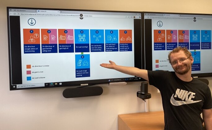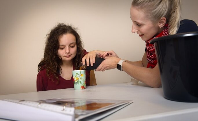 In een zintuigenverhaal vertel je een verhaal over een herkenbare gebeurtenis. Daarbij gebruik je verschillende voorwerpen die de zintuigen prikkelen. Begeleider Miranda Ploeg laat zien hoe Sarah (op de foto) en Edwin, die beide een auditieve en verstandelijke beperking hebben, plezier beleven aan de zintuigenverhalen die zijn ontwikkeld bij Kentalis. | Fotografie Martine Sprangers