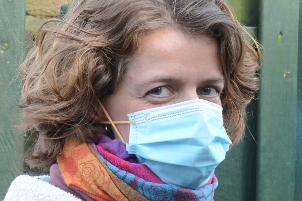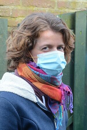 Jolijn wordt thuisgebracht. Ik loop naar haar toe om haar te begroeten. Omdat ze slecht ziet, zorg ik dat ik in haar gezichtsveld kom. Ze kijkt naar me en voor ik er erg in heb, heeft ze het mondmasker van mijn gezicht getrokken en twee rode strepen op mijn wang achtergelaten.