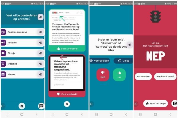 Je geeft aan op welk platform je bent (Chrome, Facebook, Vinted, Snapchat etcetera) en vervolgens krijg je een aantal vragen. Zoals: heb je een vraag over een nieuwsbericht, een filmpje, een reactie op nieuws, een sms-bericht met betaalverzoek? Aan de hand van de antwoorden geeft de app aan of het waarschijnlijk nep of echt is.