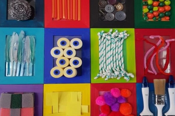 Op de foto zie je een voel- en kijkbord, waarvoor allerlei sponsjes, knopen, touwtjes en zelfs kwasten in houten fotolijstjes zijn geplakt. Een hele collage van deze lijstjes bij elkaar maakt dit tot een voel- en kijkbord. |