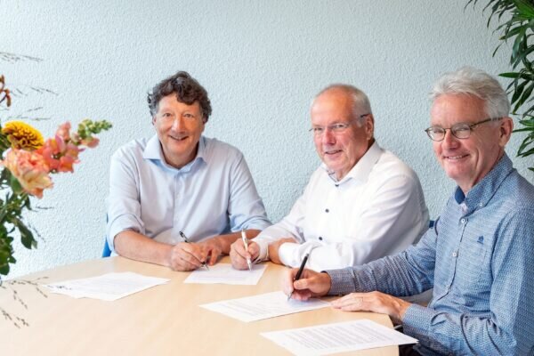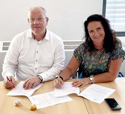 Op de foto: Half september tekenden de bestuurders van zorgorganisaties Sherpa en Amerpoort, al sinds 1969 zijn Sherpa en Amerpoort in Baarn buren van elkaar, een overeenkomst met daarin afspraken over het onderzoeken van de effecten van een eventuele fusie.