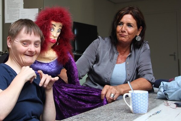 Een lapje, een klodder plaksel en een zelfgebreid wolletje. Een activiteitenbegeleidster maakt papier-maché poppen met en ván cliënten. Via de poppen krijgt ze op een speelse manier contact met de al wat oudere mensen met een verstandelijke beperking die ze begeleidt. “Nee, daar moeten ze bij mij ook niet mee aan komen, hoor. Je laat je toch niet als een kind behandelen,” kletst Marry van Dijk mee met een vrouw die binnenkomt in niet zo’n beste bui. Ze lacht naar mij: “We zijn eigenlijk allemaal acteurs hier.” Een kalend...