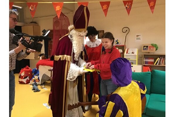 Op de foto ontvangt Mira, een blinde leerling van Visio onderwijs Breda, haar brailleletter van Sinterklaas.