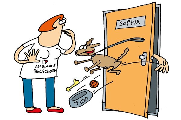 Een vrouw met een licht verstandelijke beperking die ambulante begeleiding krijgt adopteert een rescue-hond, maar krijgt spijt als ze merkt hoeveel aandacht het beestje vraagt. Het bureau neemt de hond alleen niet meer terug. Ethicus Hans van Dartel beantwoordt de vraag van een begeleider hierover, want wat kun je hieraan doen? | Illustratie Auke Herrema