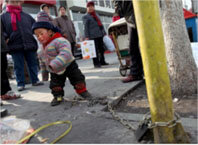 Het zusje van de 2-jarige Jingdan is kortgeleden verdwenen op dezelfde plek waar Jingdan's vader hem nu heeft vastgeketend. "Ik ben mijn oudste kind al verloren. We moeten voorzichtig zijn. We hadden geen andere keuze dan hem vast te binden," zei vader Chen Chuanliu tegen de Amerikaanse nieuwszender Cnn.