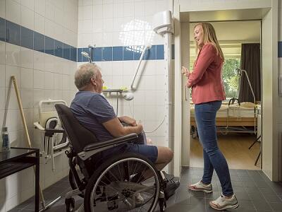 Ook Tonnie kreeg zo’n rondleiding op afstand. Tonnie heeft twee herseninfarcten gehad. “Thuis wonen ging niet meer en ik was blij dat ik een plek kon krijgen in de Klokkenbelt. Voor ik erheen verhuisde, heb ik met Nina alles doorgesproken: verlichting, gordijnen, de deur openen, douchen, afdrogen, noem maar op. Ik wilde graag dingen die mij zelfstandiger zouden maken en het leven makkelijker. Daarom kreeg ik bijvoorbeeld een doucheföhn, waarmee ik me zelf kan afdrogen. Ik kan nu rustig mijn ding doen en hoef niet op te schieten, omdat er iemand staat te wachten die naar de volgende bewoner moet.”