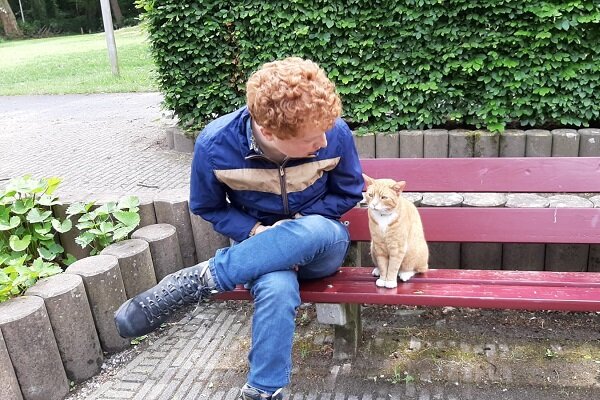 Al weken loopt een kat, Schooier hebben we hem genoemd, met ons mee tijdens de wandeling met cliënten. Zelfs Karel is al helemaal gewend dat de kat erbij hoort. Karel loopt achteraan en wacht als iemand anders in ons groepje stopt met lopen. Hij wacht nu dus ook op Schooier als die een andere route neemt. De eigenaar is onbekend, dus na de wandeling geef ik de kat te eten. Schooier weet het al precies.