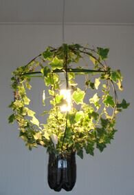 hanglamp van metaal, waarin klimop groeit. Het bladgroen geeft het licht een