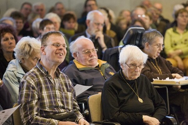 In de pikorde van de samenleving staan mensen met een verstandelijke beperking achter in de rij, zelfs al figureren zij tegenwoordig in medezeggenschapsraden en worden zij burgers genoemd. Maar met de aangekondigde bezuinigingen zet het kabinet hen opnieuw achter in de rij. Hoe gaat dat in de kerken? Sommige kerken schenken aandacht aan deze opvallende leden. De woordkeuze verraadt de visie achter deze aandacht: aangepaste kerkdiensten, aangepaste catechese. Ik word niet altijd vrolijk van bijvoorbeeld tekstkeuze, liedrepertoire en ...