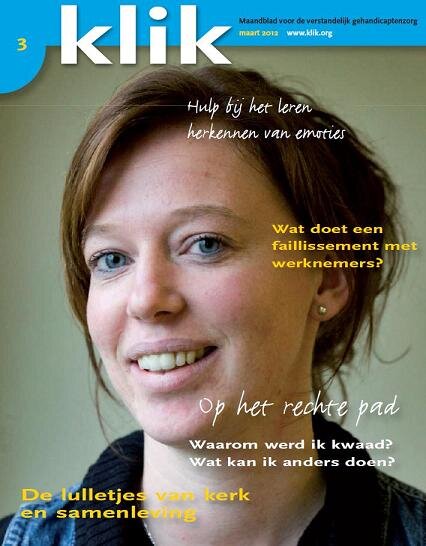 De nieuwe Klik gaat over licht verstandelijk gehandicapten die door hun onbeheerste gedrag in extreme problemen zijn geraakt. Een psychologe en begeleiders van Trajectum vertellen hoe zij cliënten begeleiden die een justitiële maatregel opgelegd hebben gekregen. Daarnaast artikelen over het herkennen van emoties en over de kerk.