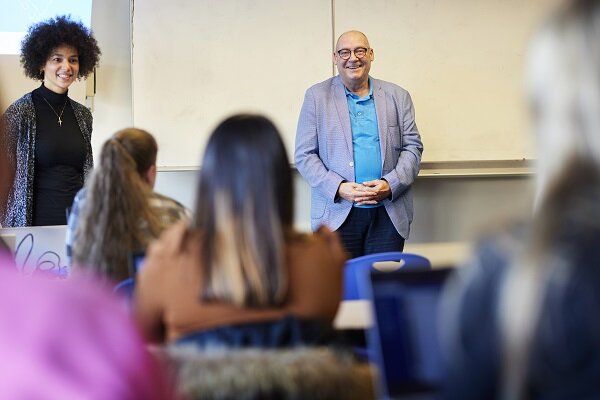 Op de foto: Ervaringsdeskundige Ad van Ginneken verzorgt samen met mbo-docent Sheelah Nulkes een gastles binnen in de lesmodule Verslaving op ROC Tilburg.