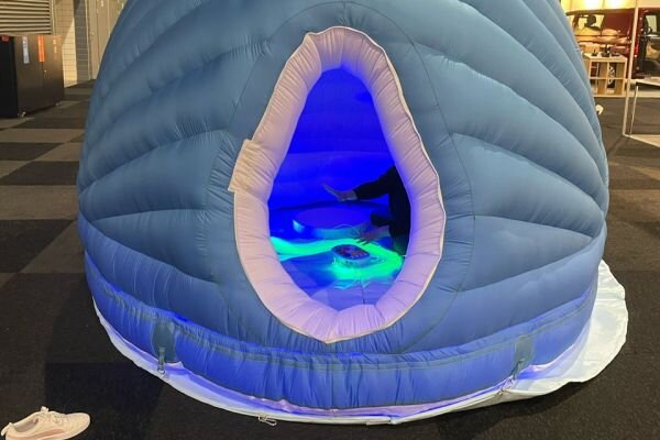 De SnoezelBox is een mobiele snoezeliglo, die in 10 minuten opgezet kan worden. In deze tent is alles interactief en je kunt zelf bepalen wat je aan of uit wilt hebben met betrekking tot geluid, licht en effecten. De iglo is voorzien van zachte vloermatten, een geruisloze compressor, een draagbare ballenbak, een controlunit met kleurschakelaars, een led-projector, speakers, een discobal, wifi-ledstrip en een vezelnevel. De tent is vooral handig als het lastig is om cliënten te verplaatsen naar een andere ruimte om te snoezelen. Die verplaatsing is niet nodig als je de box ter plekke kunt opzetten.