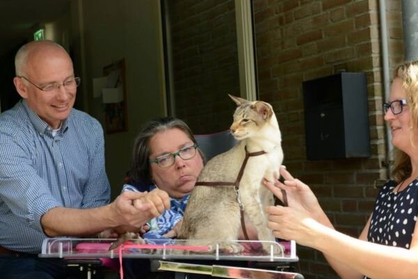 “Fiona heeft bijna dagelijks last van zware epileptische aanvallen. Haar mimiek is moeilijk af te lezen, waardoor haar gedachten niet tot nauwelijks te doorgronden zijn. Spasmes spelen haar helaas ook parten. Haar armen houdt ze constant strak tegen haar lichaam aan, wat bijvoorbeeld de dagelijkse zorg bemoeilijkt. Toen de kater door zijn begeleidster Maike op haar rolstoelblad werd neergezet, leek ze in eerste instantie emotieloos te reageren. Ik hielp haar vervolgens met het aaien van de kat. Langzaamaan leken de prikkels en de informatie bij haar binnen te komen. Na verloop van tijd begon ze haar lichaam steeds meer te ontspannen. Hierdoor kon ik haar arm losjes optillen en vrij bewegen. Iets wat zelden voorkomt. Ik heb daarna vol verbazing deze ervaring aan al mijn collega’s nog lang benoemd.”