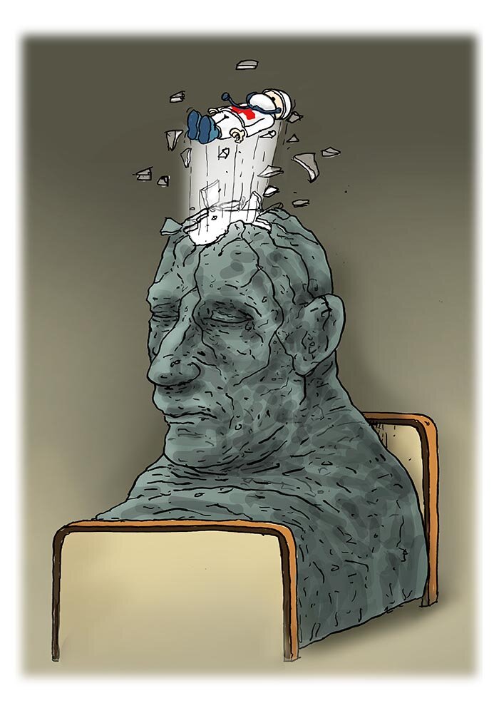 Spel is de taal van een kind. Misschien wel de taal van alle mensen. Dat merk ik bij Klaas die bij mij wordt aangemeld voor speltherapie. Hij heeft een verstandelijke beperking en is al wat ouder, 72 jaar. En hij durft al jaren niet meer in zijn bed te slapen. | Illustratie Joep Bertrams
