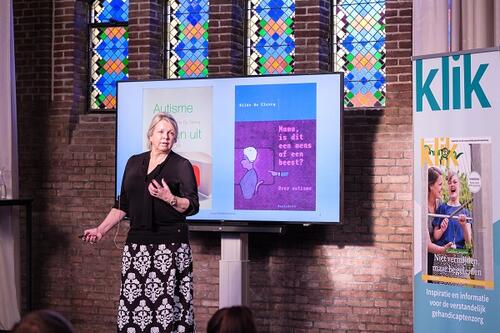 Trainer Hilde De Clercq, auteur van diverse boeken op het gebied van autisme opende de Klik-themadag Autisme op 30 september in Eindhoven en was ook de dagvoorzitter. Zij begon met het inleven in en beter begrijpen van mensen met autisme en een verstandelijke beperking.