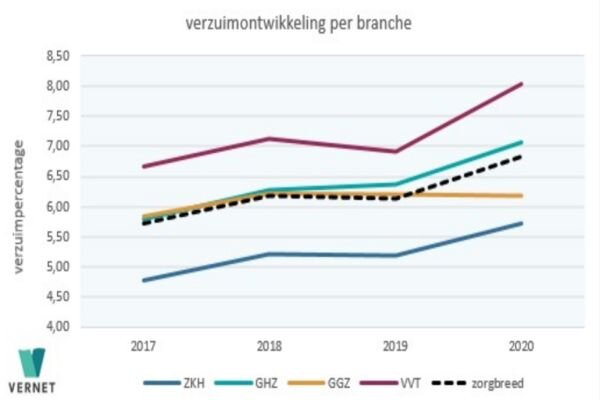 • Verzuimpercentage VVT-sector: 8,03, stijging van 16 procent ten opzichte van 2019