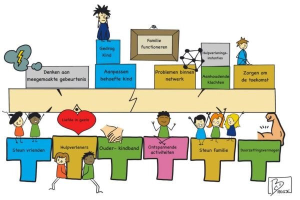 Door gesprekken over wat iemand kracht geeft (T-blokken) kunnen er meer T-blokken worden toegevoegd onder de balk. Uiteindelijk heeft de balk dan voldoende steun om niet te breken. Ook van de gewenste situatie wordt een foto gemaakt. Zo visualiseer je wat er nodig is voor herstel, zowel vanuit jezelf (ik-krachten), familie (familiekrachten) als vanuit het netwerk (eco-krachten).